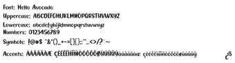 Hello Avocado, Windows platformunda çalışan, samimi ve neşeli bir yazı tipi ailesidir. Yuvarlak ve el çizimi tarzındaki harfleri ile sıcak bir hava yaratırken, kalın ve hafif düzensiz çizgileri ile rahat bir görünüm sunar. Tasarım projelerinde eğlenceli ve davetkar bir atmosfer oluşturmak için mükemmel bir tercihtir. Farklı ağırlık seçenekleri ve daha hafif kontur stilleri ile esneklik sunarak, dikkat çekici logolar, ilginç posterler, canlı ambalajlar veya neşeli davetiyeler oluşturmayı sağlar.